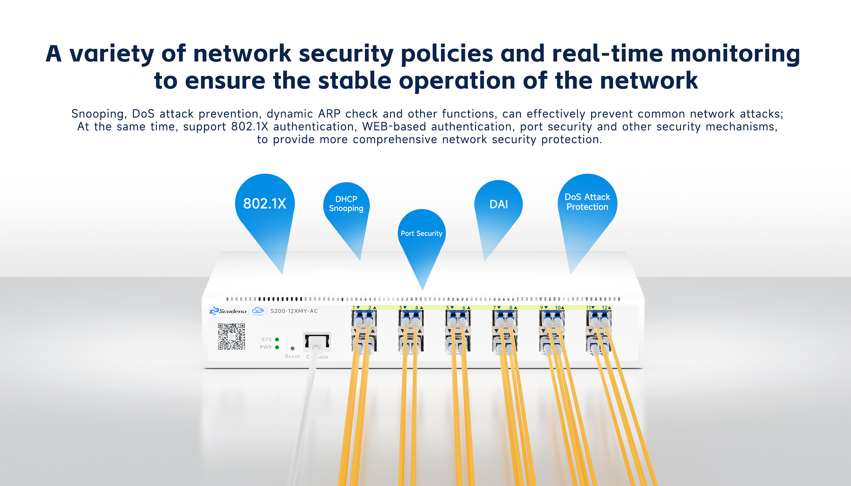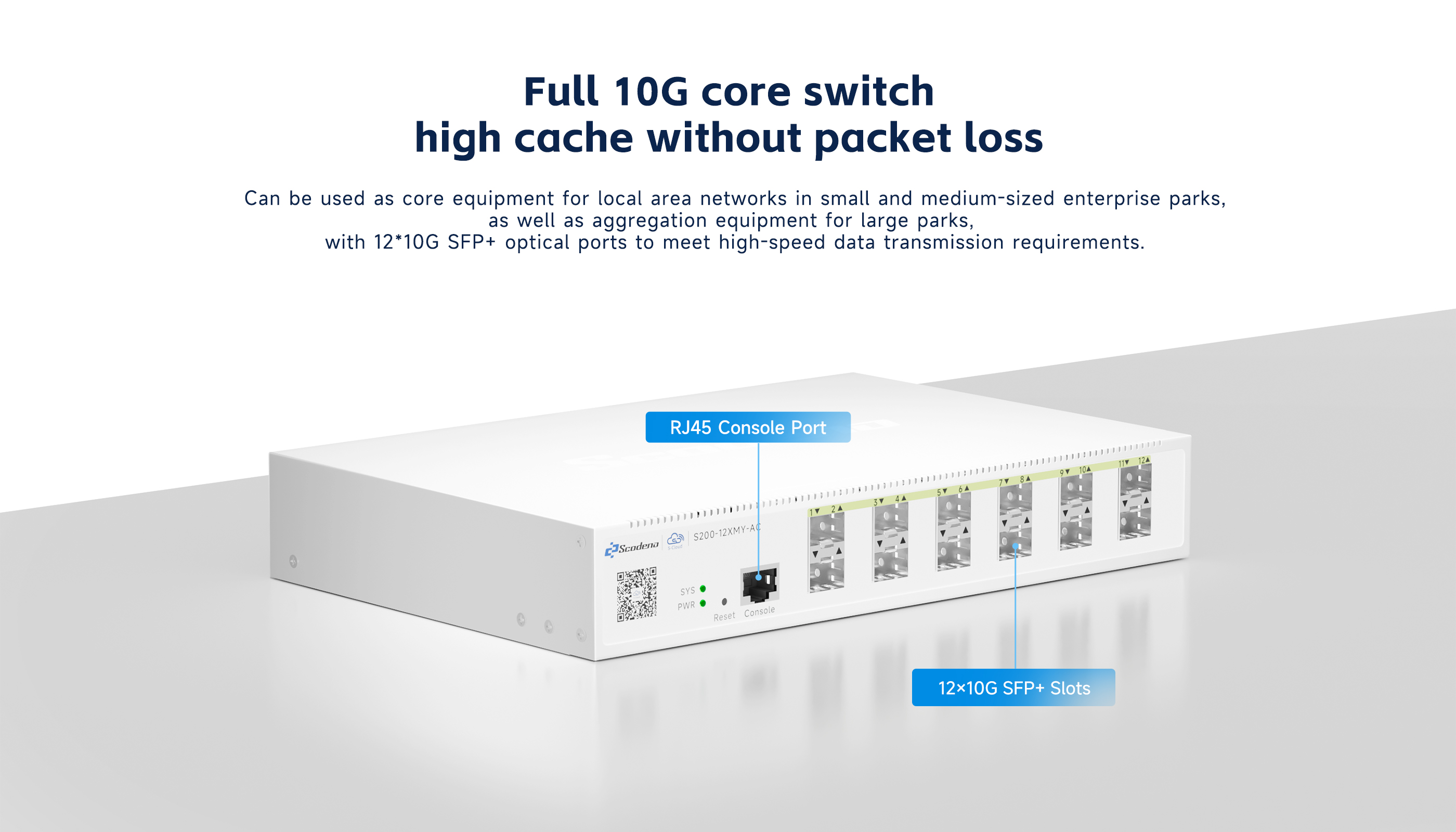 S200-12XMY-AC features 12*10G SFP+ optical ports. Utilizing store-and-forward technology with QoS integration, it ensures efficient bandwidth allocation across all ports for stable data transmission. The system provides multiple management options including CLI, web interface, and cloud-based administration, delivering intuitive operation and simplified maintenance.