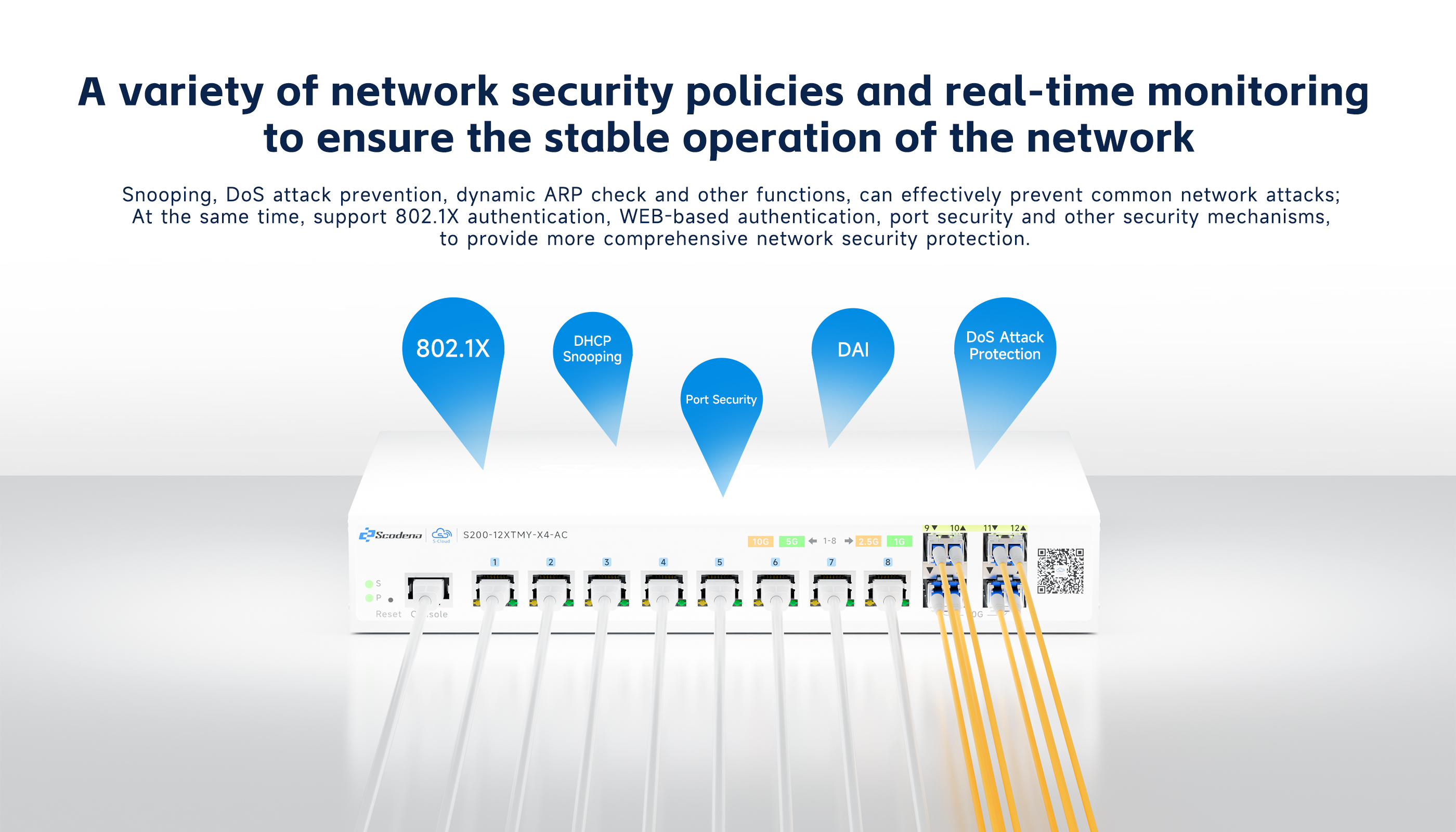 S200-12XTMY-X4-AC features 8*10G RJ45 and 4*10G SFP+ optical ports. Utilizing store-and-forward technology with QoS integration, it ensures efficient bandwidth allocation across all ports for stable data transmission. The system provides multiple management options including CLI, web interface, and cloud-based administration, delivering intuitive operation and simplified maintenance.